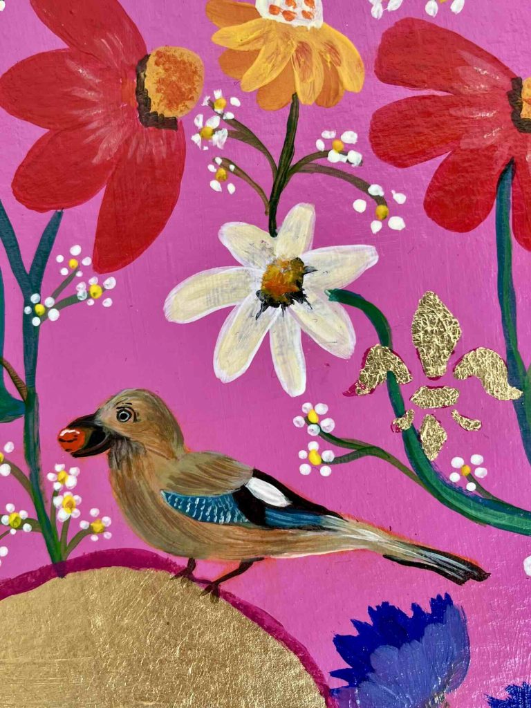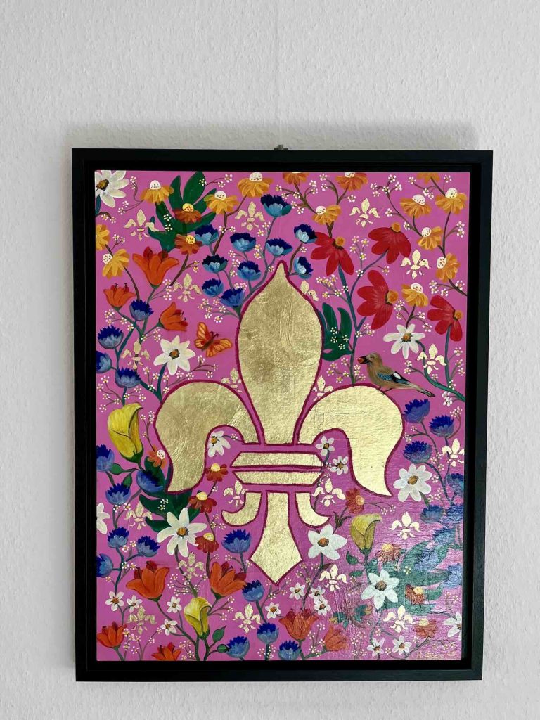 Als Künstlerin aus Fulda liegt es mir am Herzen, Motive aus meiner Heimat in meine Kunst einfließen zu lassen. Besonders gerne habe ich dieses Werk geschaffen: eine große, stilisierte Lilie aus dem Fuldaer Wappen. Gemalt in Acryl auf Acrylpapier, verleiht das aufgetragene Künstlerblattgold der goldenen Lilie eine besondere Strahlkraft. Vor dem leuchtend rosa Hintergrund öffnen sich Blüten in Gelb, Rot, Weiß und Orange – ein farbenfrohes Spiel, das Lebendigkeit ausstrahlt. Auf einem der Lilienblätter hat ein kleiner Vogel Platz genommen und schenkt dem Bild Leichtigkeit und Bewegung.