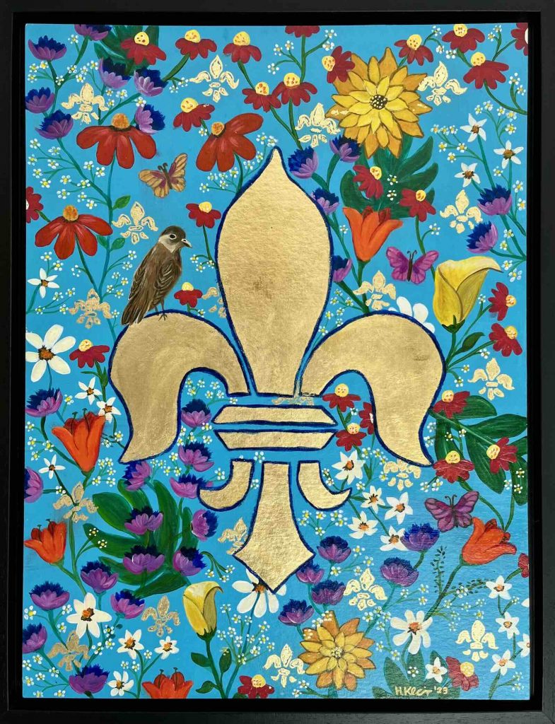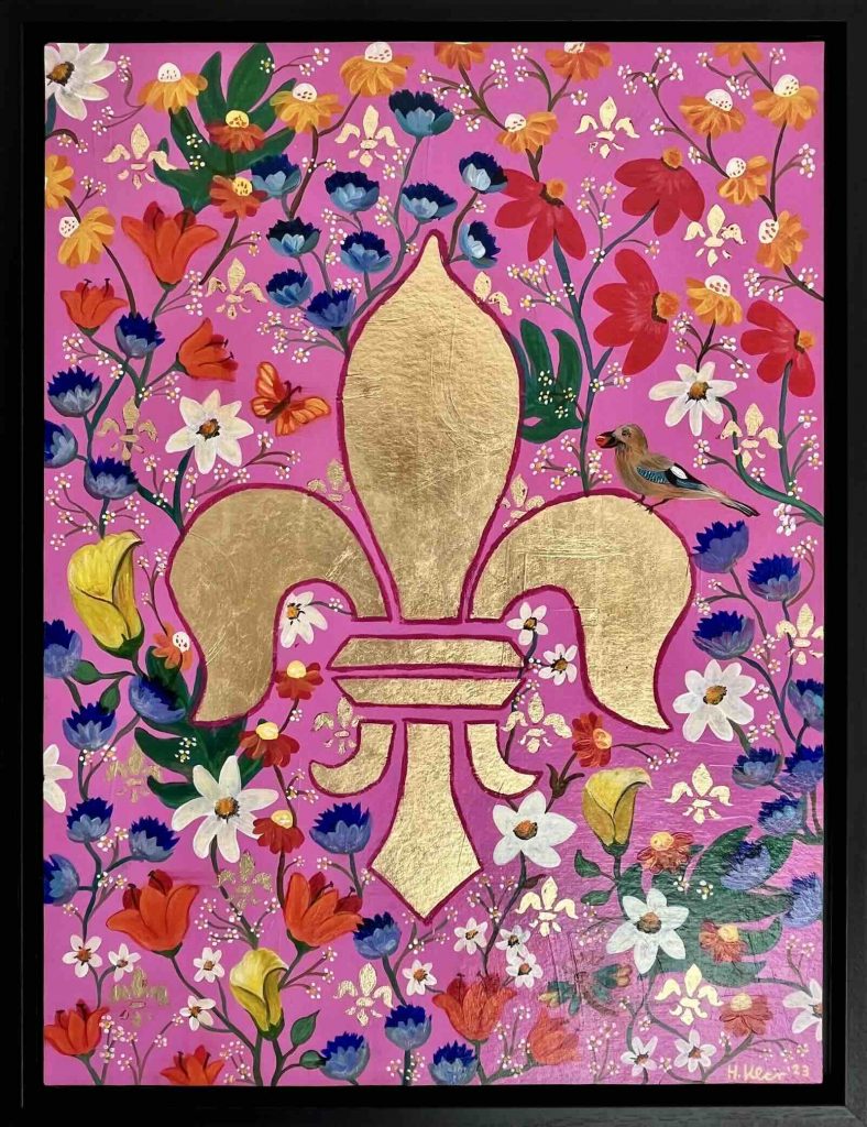 Vor dem leuchtend rosa Hintergrund öffnen sich Blüten in Gelb, Rot, Weiß und Orange – ein farbenfrohes Spiel, das Lebendigkeit ausstrahlt. Eine große, stilisierte Lilie aus dem Fuldaer Wappen, gemalt in Acryl auf Acrylpapier, verleiht durch das aufgetragene Künstlerblattgold der goldenen Lilie eine besondere Strahlkraft. Auf einem der Lilienblätter hat ein kleiner Vogel Platz genommen und schenkt dem Bild Leichtigkeit und Bewegung.