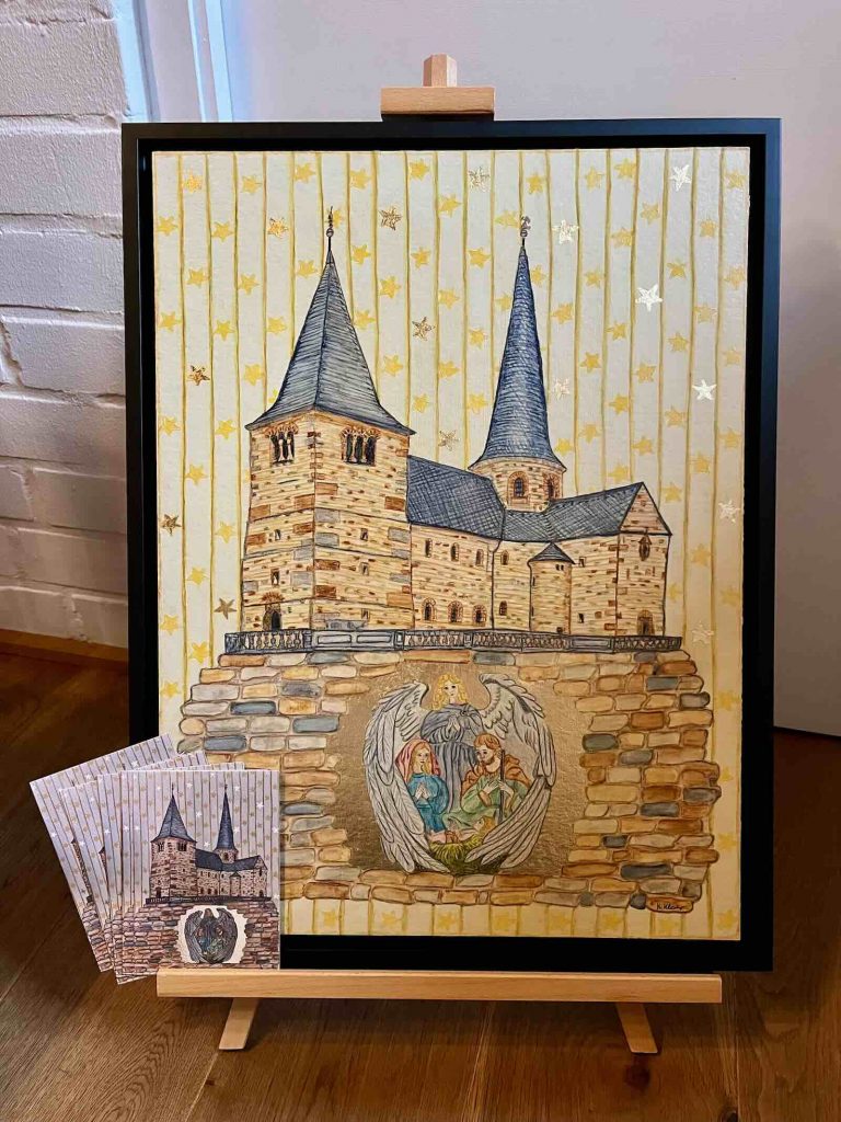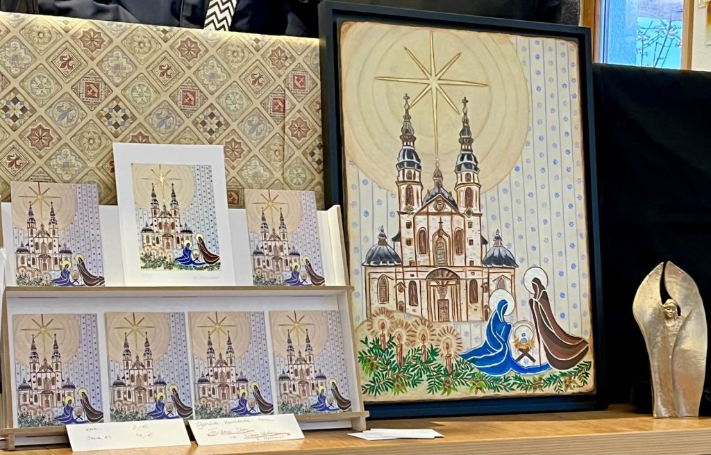 Meine tiefe Verbundenheit zu Fulda prägt viele meiner Arbeiten – und ganz besonders jene Motive, die meine Heimat in der Weihnachtszeit zeigen. Die Idee, weihnachtliche Fulda-Motive zu gestalten, entstand im Gespräch mit den Benediktinerinnen, die in ihrem Klosterladen bereits seit einiger Zeit Drucke meiner sogenannten Osterbilder anbieten. Sie fragten mich, ob es auch ein Weihnachtsmotiv gäbe – und so wuchs der Wunsch, die besonderen Orte meiner Heimat in festlichem Licht erstrahlen zu lassen.