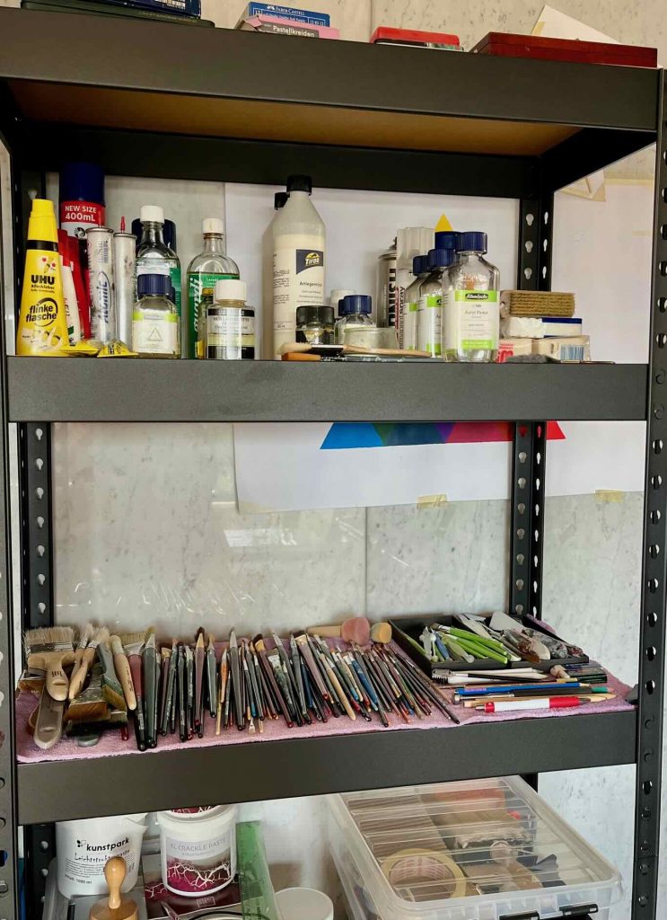 Neue Regale, Farben sortiert, Spachtel und Strukturkämme wieder an ihren Platz. Mein Atelier atmete tief durch und ich gleich mit.