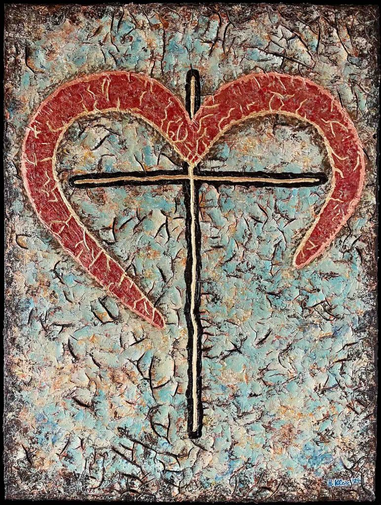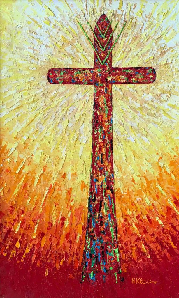 Risse erleben wir derzeit so Allerlei. Ob es das Wissen um all die Krisen ist, um Kriege, Umweltveränderungen, strukturelle Umbrüche, oder vielleicht einschneidende Ereignisse, welche zum Lebensverlauf eines jeden Menschen gehören. Es stellt sich die Frage: Was trägt uns durch diese Zeiten? Das Osterbild 2024 gibt Antwort: Der Hintergrund besteht aus Rissen, die symbolisch für aufbrechende Strukturen und Veränderungen in unserem Leben stehen. Diese Risse sind jedoch auch Räume, die sich mit neuen Inhalten, Licht und Hoffnung füllen können. In den Rissen unseres Lebens wird Gott spürbar. Inmitten dieses zerklüfteten Hintergrunds entsteht in den Rissen ein goldenes Kreuz als Zeichen der Erneuerung. Das ist die Osterbotschaft: Trotz schwieriger Situationen ist ein strahlender Neuanfang möglich. Ostern erinnert uns stets daran, dass nach dem Leiden und der Dunkelheit die Auferstehung und der Sieg über Verzweiflung kommen. Dies gibt Hoffnung und steht für das Leben, den Neubeginn und Gottes Liebe zu den Menschen. Das goldene Kreuz wird von einem großen Herz umrahmt, das all die guten zwischenmenschlichen Taten tröstender, einfühlsamer und helfender Menschen verkörpern soll. Gott zeigt sich durch gelebte Mitmenschlichkeit, die Risse kitten und Brücken bauen kann. Zu allen Zeiten ist Gott uns nah und so darf Ostern uns stärken und unsere Herzen für andere Menschen öffnen!