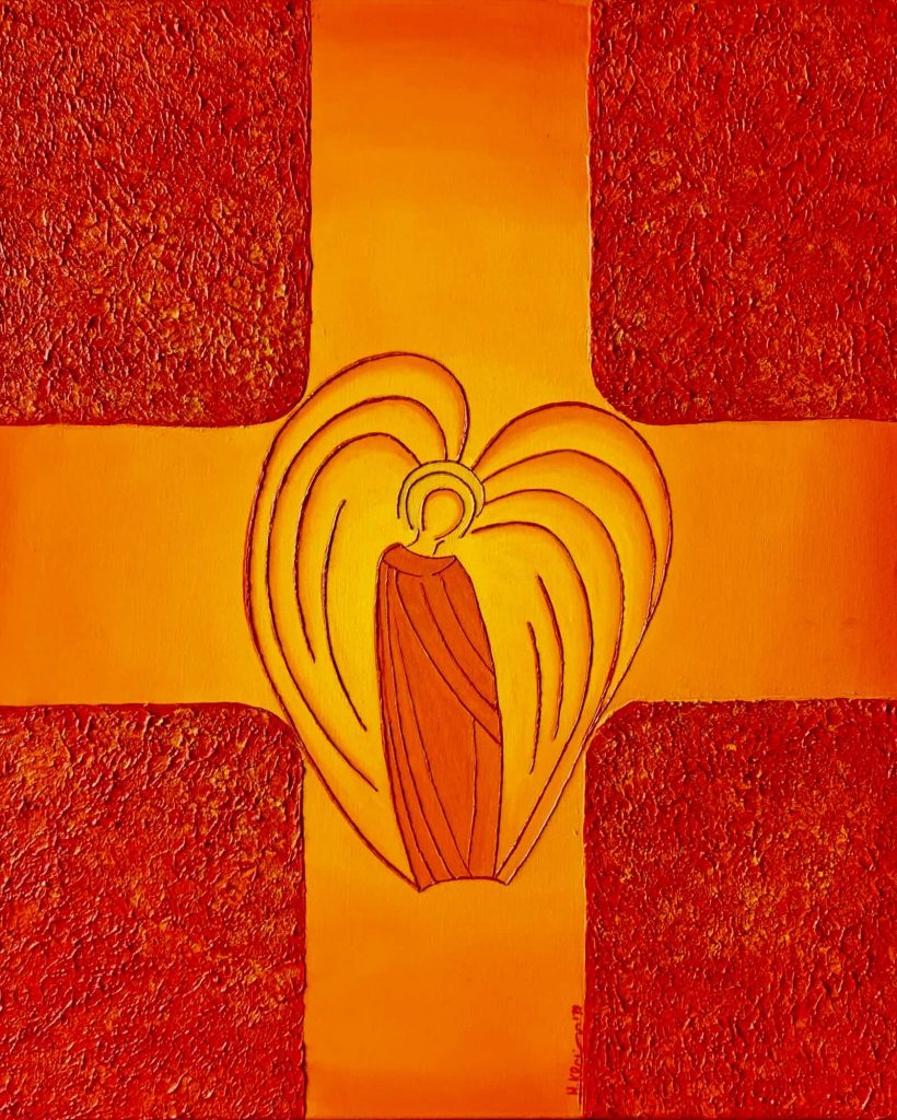 Aus dem Osterbild strahlt farbenfroh die österliche Freude in unser eigenes Leben hinein. Das dominierende Orange symbolisiert Optimismus und Lebensfreude. Es repräsentiert Licht, Geborgenheit sowie emotionale Wärme. Unwiderruflich eng mit Ostern verbunden ist das Kreuzsymbol. So bildet ein Kreuz den Hintergrund des Bildes. Die vier Blöcke an den äußeren Seiten sind uneben gestaltet. Sie erinnern an die Zeiten unseres Lebens, in denen es nicht ‚glatt läuft‘, die geprägt sind von ganz persönlichem Leid. Gott führt uns Menschen, sinnbildlich gesprochen, nicht am Kreuz vorbei. Leid und Schmerz existieren in der Welt und auch in jedem einzelnen Leben. Doch seit Jesu´ Tod und seiner Auferstehung können wir gewiss sein, dass sich Gott uns zur Seite stellt und mit uns gemeinsam durch leidvolle Zeiten geht.