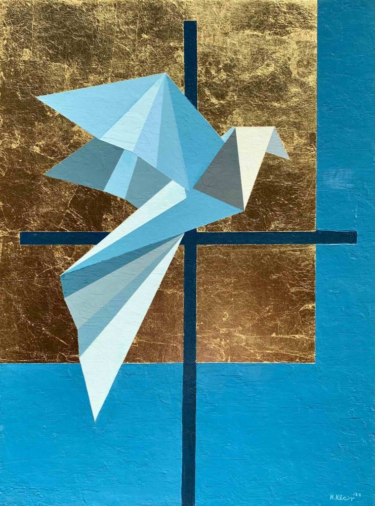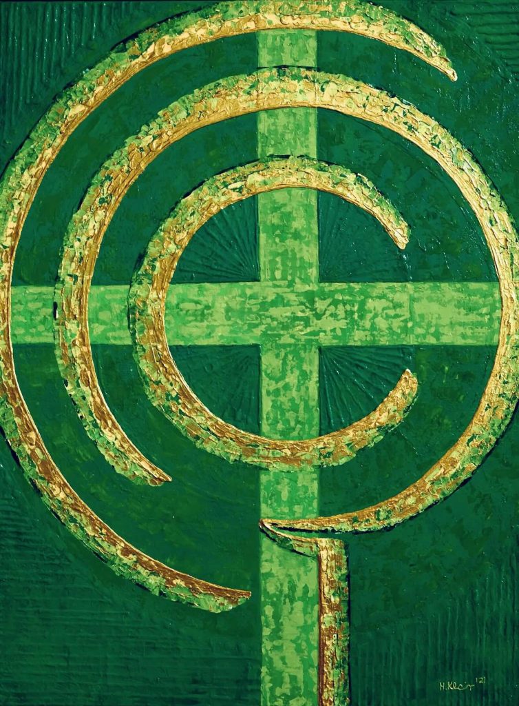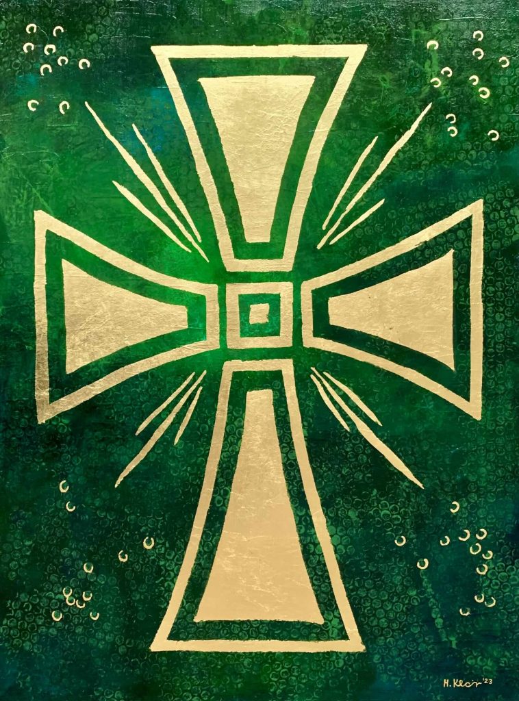 Das Osterbild 2023 zeigt genau diesen Prozess des österlichen Wunders. Aus einer diffusen Dunkelheit heraus, erstrahlt stark und hell ein göttlich goldenes Kreuz. Obwohl der Hintergrund sehr düster erscheint, ist er in Grüntönen angelegt. Grün als die Farbe der nährenden Hoffnung und des steten Neubeginns. Die vom Kreuz ausgehenden Strahlen verbreiten sich in alle Himmelsrichtungen und erzählen vom Wunder der Auferstehung. Die winzigen, in Gold gefassten Samen sind hellgrün und tragen das göttliche Licht in die Welt hinaus, um an unbestimmten Orten zu keimen und einen Neuanfang zu wagen.