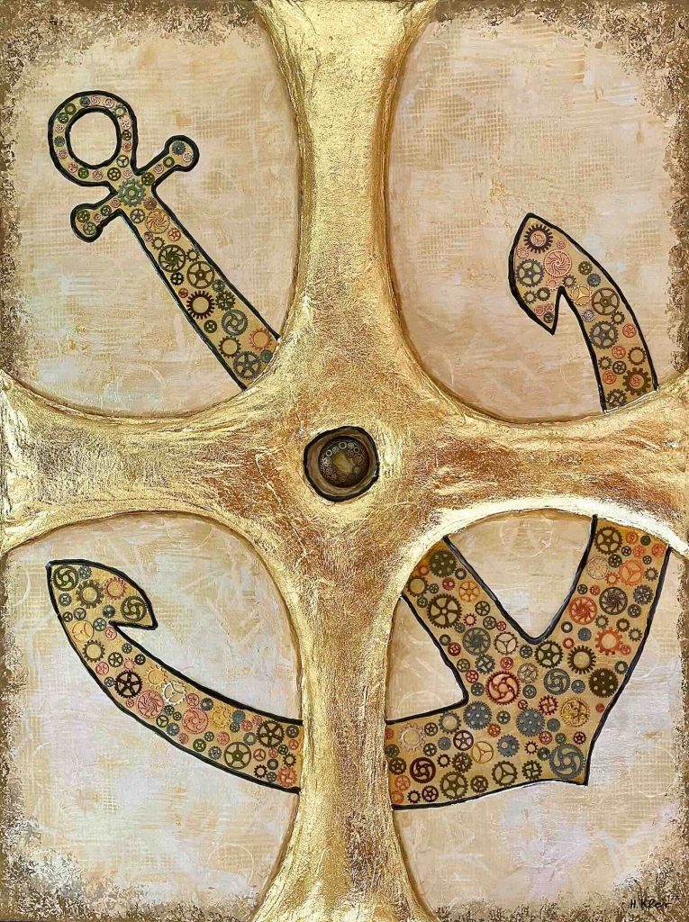 Das Kreuz als Sinnbild des Glaubens durchzieht den Anker als Symbol der Hoffnung. Die Botschaft des Kunstwerks lautet: Trotz aller Herausforderungen und Komplexität unseres Daseins entsteht ein hoffnungsvolles Ganzes – getragen von Gottvertrauen.