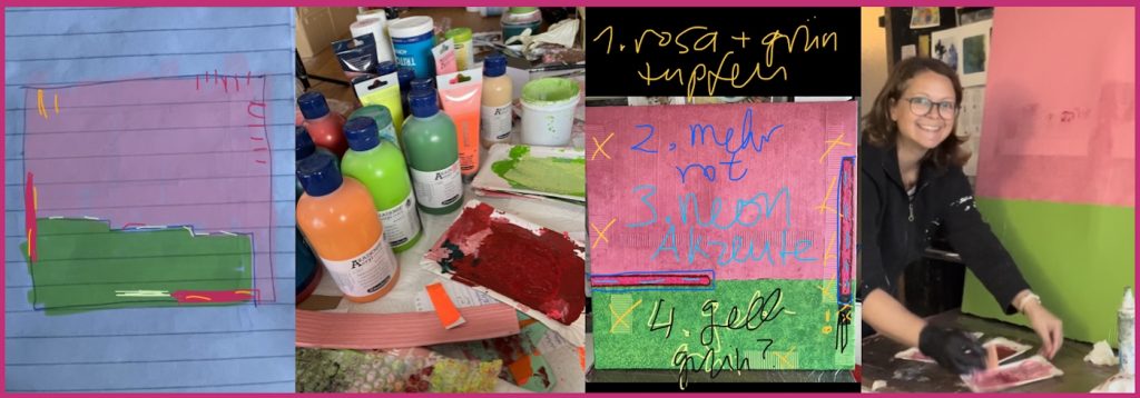 Ein helles Rosa, ein frisches Gelbgrün, zwei leuchtend pinke Akzentstreifen – so entstand ein Bild, das Wärme ausstrahlt, das atmet und sich mit dem Raum verbindet.